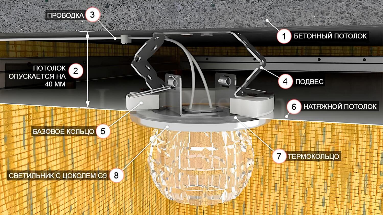 Монтаж приборов с цоколем G9 проходит по стандартной схеме. Так как светильник полностью выступает за полотном, а свет всегда направлен вниз, особых требований к дизайну и монтажу нет.